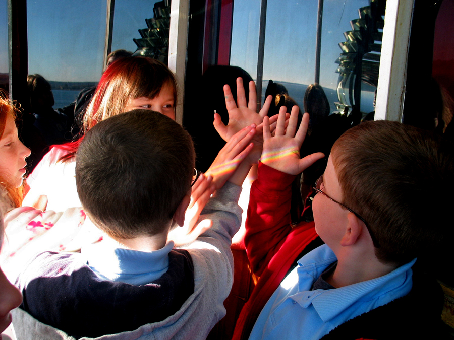 Jennings 4th-grade SEMI students learn about the Grandma Sue from museum docent Archie Chester. At the age of eight, Archie's grandfather dreamed of building a boat of his own design and sailing it to Florida. After a lifetime spent working in the saw pit of the Thames Tugboat yard and raising a family, at age 78 Archie's grandfather built his boat and sailed south through the inland waterways. In fact, late in life, Mr. Chester became a media star! At the Custom House last week, students saw the hand tools Mr. Chester used to build the boat and a Grandma Sue model created by museum trustee Robert Stewart. Above are Archie Chester, in his grandfather's hat, and SEMI teacher Jody Barthel with the Jennings students. In all, about 80 SEMI students will visit the museum this month.