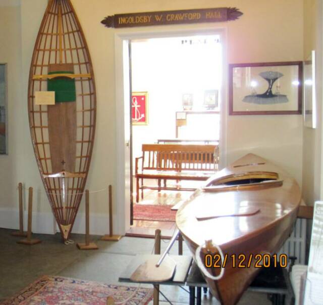 In short, a canoe can be anything from a dugout to a large war canoe. It may be propelled by single or double paddles, by one or more paddlers, or by sail. It may have no sail or as many as three. It may have a full deck, a partial deck, or be entirely undecked. It may be smooth bottomed or have a rudder or centerboard. Because the wooden boat on display in the Museum is a direct descendent from the paddle canoes of the 1900s it may justifiably be called a canoe.