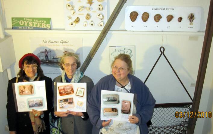 It was The Shell Club of Mystic, which, in 1989, petitioned the state & succeeded (Bill no. 263) in making the Eastern Oyster, Crassostrea virginica, Connecticut's official state shell. Why a state shell? The Club wrote (back in 1989) "A national effort is being made to secure endorsement of a shell to represent the state in which it lives." The Purpose? "A symbolic gesture by the State of Connecticut to represent what this natural resource had given to us both historically and economically." The Club contributed their oyster board, seen at the back center of the photo at left, to our Awesome Oyster exhibition. Shown here are three members of the club, who shared their photo scrapbook made of the Custom House's exhibit: The Awesome Oyster. From left: Barbara Bauduccio, Martha Bauduccio, Trudy Alduk.
