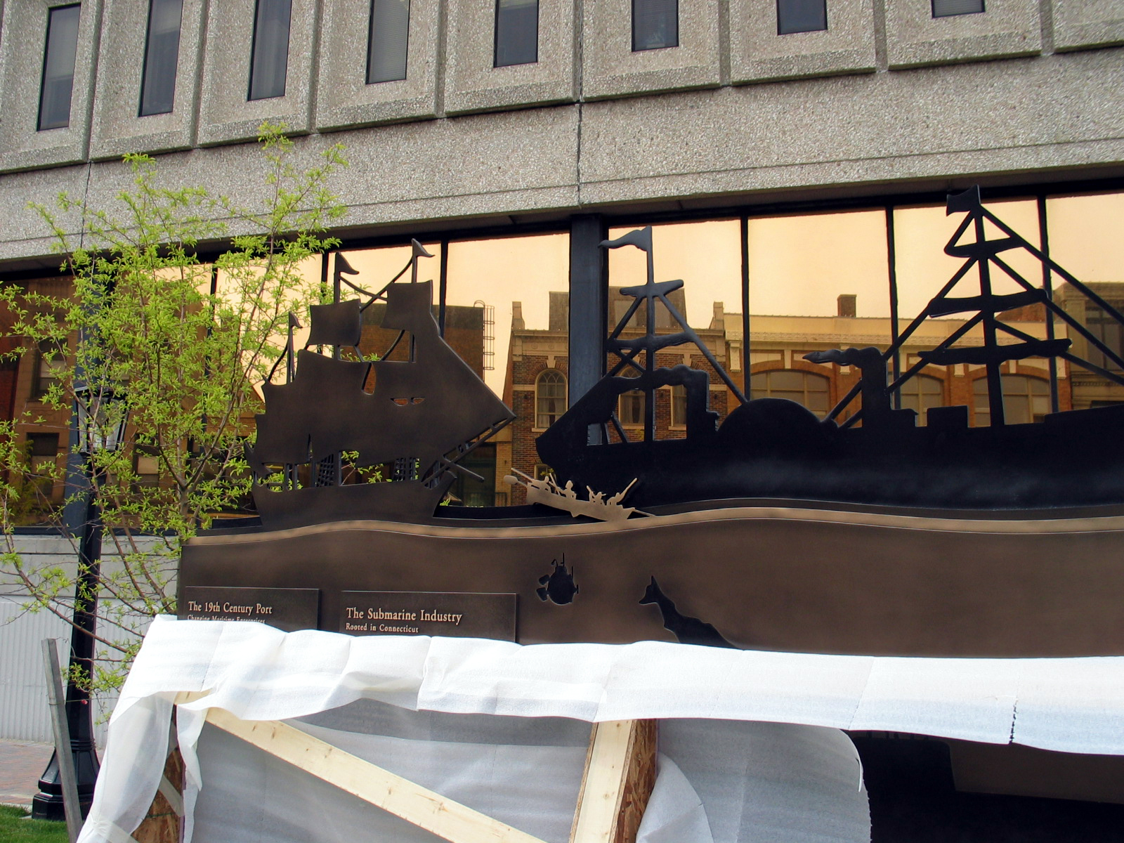 On the other hand, another ongoing project: New London's PARADE, is looking wonderful. This week, the bronze panels arrived in their packing crates. The series of vessels in the photo near left shows the evolution of ships from sailing vessels to steam ships to submarines.