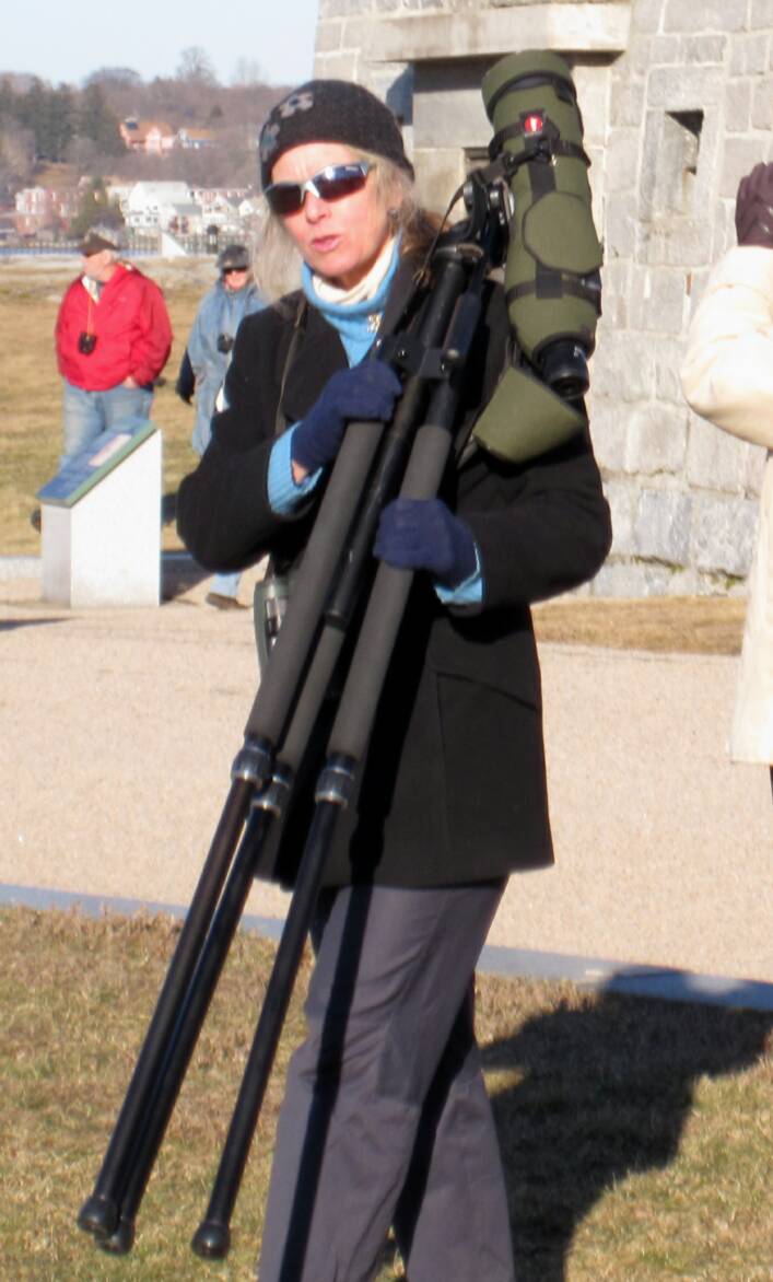 1.23.10 About a dozen intrepid birders followed Maggie Jones, executive director of the Denison Pequotsepos Nature Center, out to Fort Trumbull, Pfizer, Waterford Park & Ocean Beach on Saturday to seek out winter water birds. It was the continuation of a winter birding celebration at the Custom House, featuring Maggie's Third Thursday talk on Winter Birds along the Shoreline, two small hand-built boats by David McCulloch, and an exhibit of avian photographs by Hank Golet.