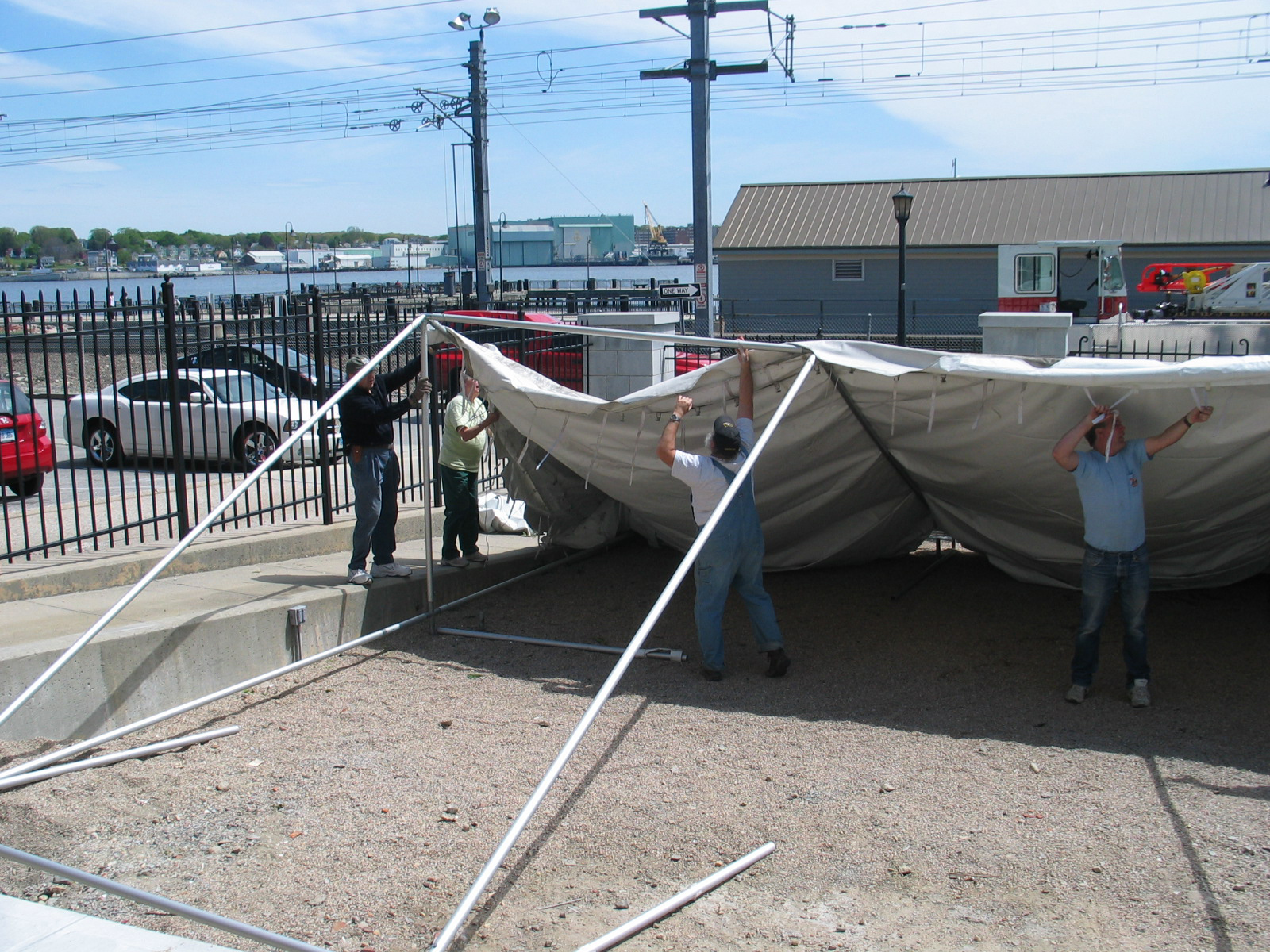 Trustees John Desjardins and George Sprecace took charge, organizing the poles and gathering the tent framing together. Then they called in the reenforcements (comprised of the usual suspects): Hillhouses Jen & Mike, Rob Groves, Bill LaRoue, Tom Hahn, Rob Pittaway. When the time came to raise the canvas, in came the heavy artilliary: the Bank-Street branch of the New London Fire Department.