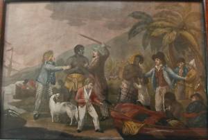 cutter Washington, “manacled… [with] a cord around his neck, to which a snuffbox was suspended” (6). Here is the salvaged history of a small item Cinqué claimed as his, and yet again it is positioned as threatening. A snuffbox, suspended from a cord, which hung around his neck. Images of lynching are barely concealed beneath the surface of this passage—the only piece of property Cinqué owns, besides himself, appears around his neck, ready to “snuff” him out, as he is brought, manacled and under arrest, into the cabin of Capt. Gedney. Did that snuff box contain snuff produced by the hands of slaves in the tobacco fields of Cuba? Was the cord made of cotton or hemp? Either could have been made by slave labor, as well.